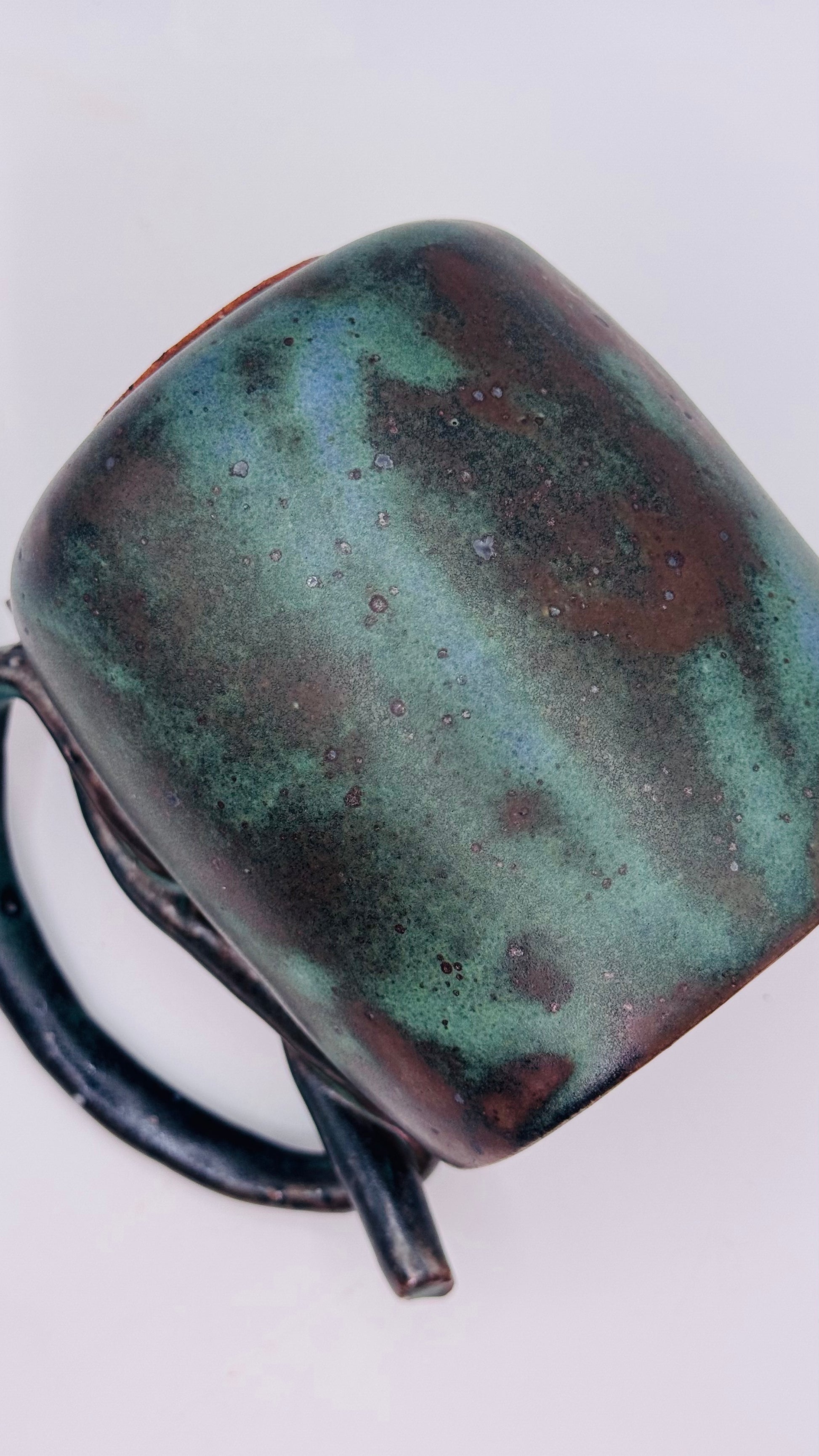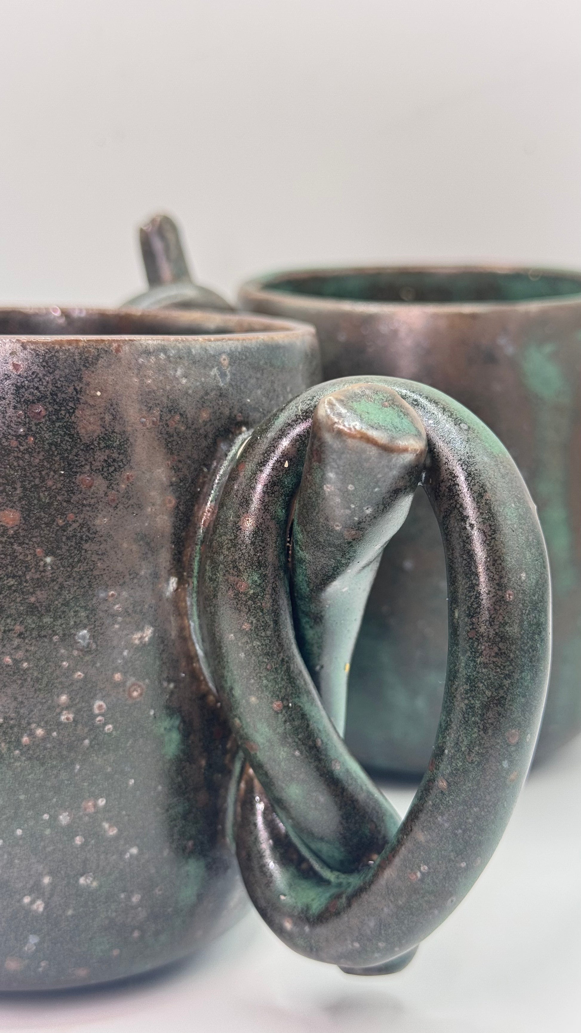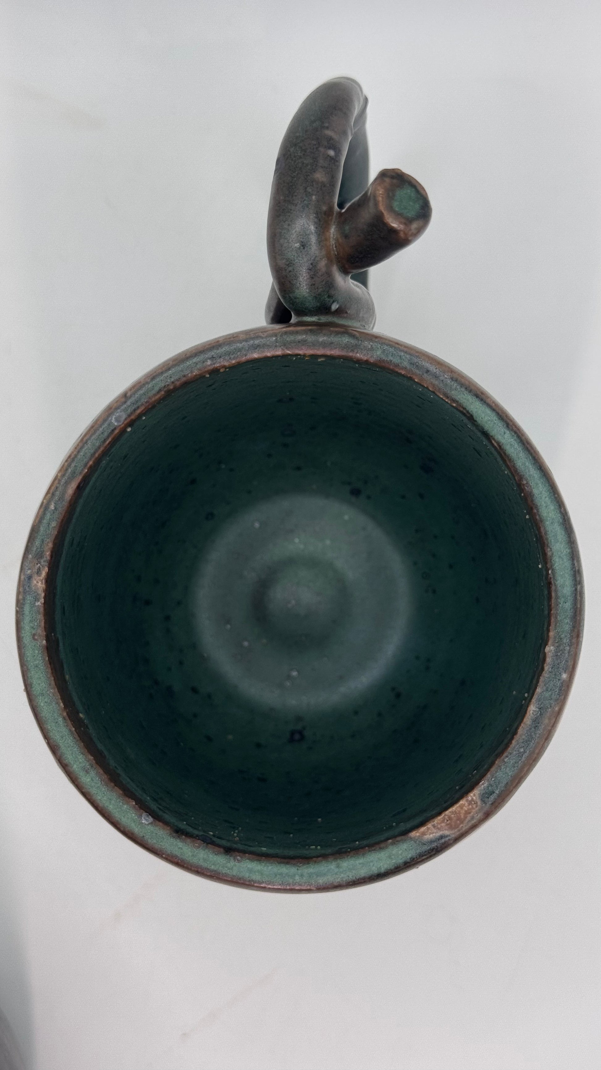 Inspired by the mood and texture of old stone streets and quiet mornings, this mug is shaped by hand and finished with a deep, speckled green glaze. The handle loops softly, almost like it’s mid-thought.